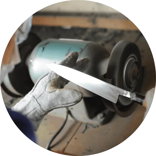 目の粗い砥石で、始めに研ぎ板に包丁を挟み、大まかに鋼を研ぎ出します。それから手に持って、微妙な手先の調節によりハガネを均一に研ぎ出します。