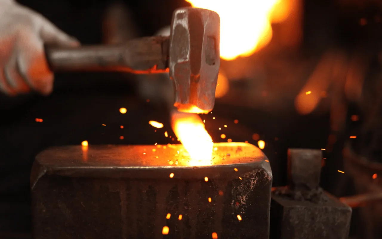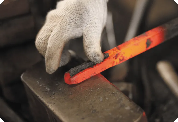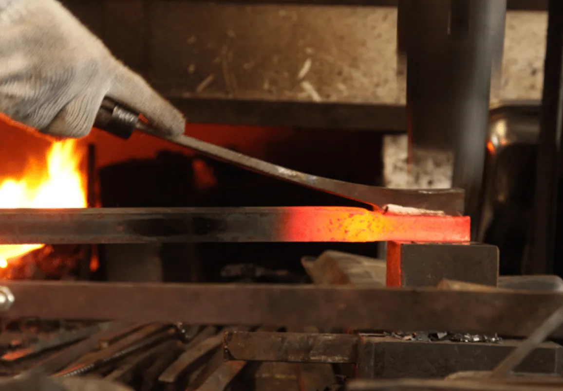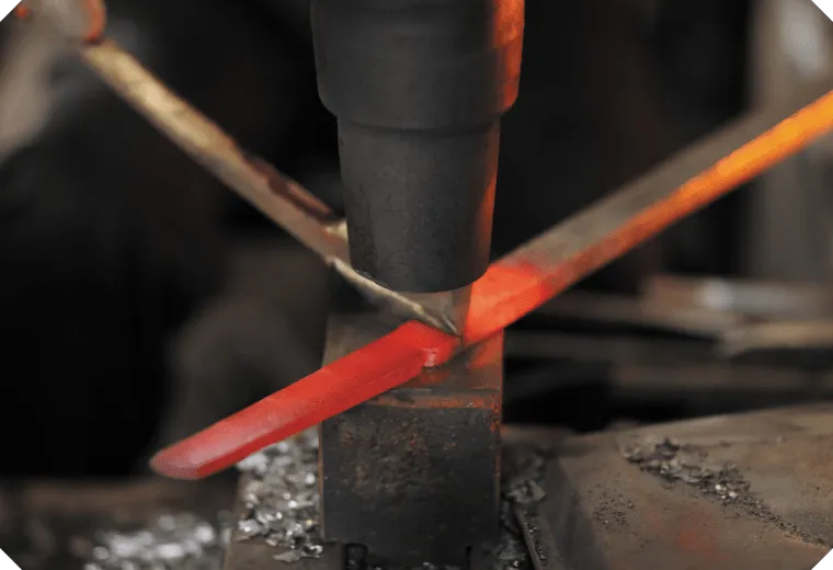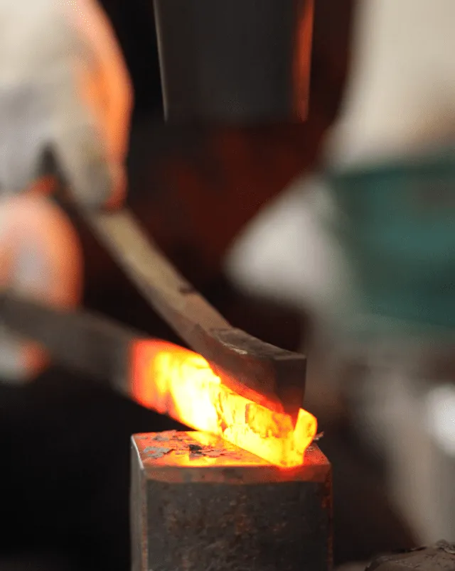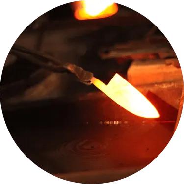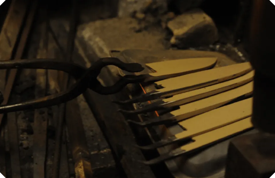 それぞれの刃物用に切り出した材料を加熱し、鍛え上げていく工程を3~4回繰り返し、鋼から炭素が抜けて本来の力が無くなってしまわない内に、素早くハンマーで刃物の形にしていきます。
