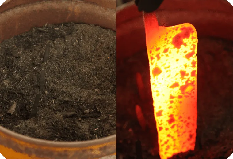 2~4の工程で加わった力による組織のムラを均一化して正常な状態に整えるため、刃物を760~800℃まで赤め、「藁灰」の中に入れ一昼夜かけてゆっくりと除冷します。