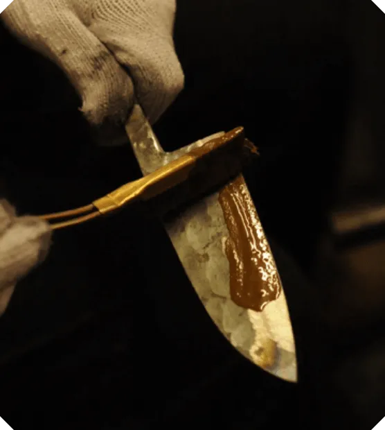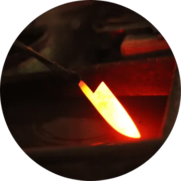 包丁の用途に合わせて、泥塗りしての「水焼き」及び「油焼き」の2つの方法で焼入れを行います。790~830℃の最適な温度までゆっくりと均等加熱した包丁を「水」または「油」に素早く入れ急速に冷却します。このとき鋼の組織が引き締まり、非常に硬度の高い構造になります(写真は泥塗りしての「水焼き」)。焼入れの温度管理は、赤まっている包丁の色具合で行われるため、長年の経験と感が必要になります。焼入れは、わずかでもタイミングを損なうと失敗に終わり、鉄クズになってしまうため、まさに「真剣勝負」と言えます。