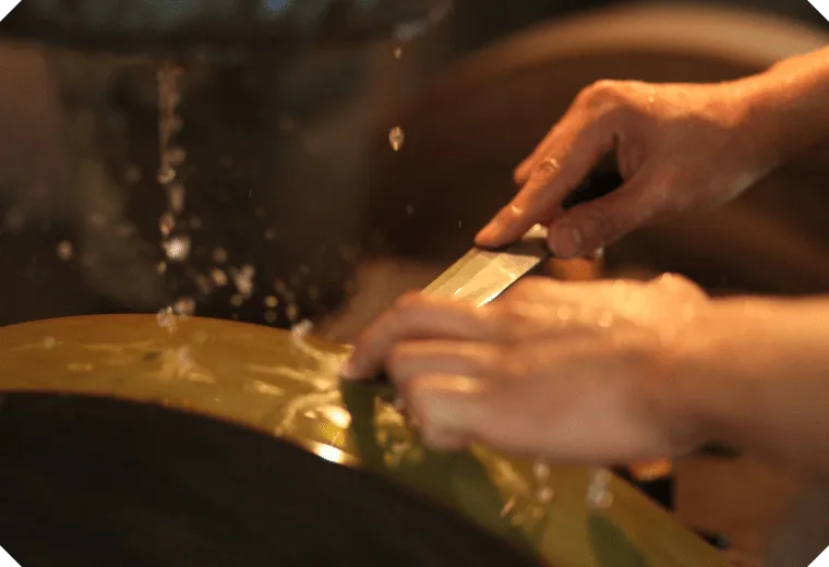 荒研ぎのままではまだ気持ちの良い切れ味ではありません。そのため、より目の細かい砥石で丁寧に手研ぎを行い、研ぎ出しした部分の表面をよりシャープに仕上げていきます。