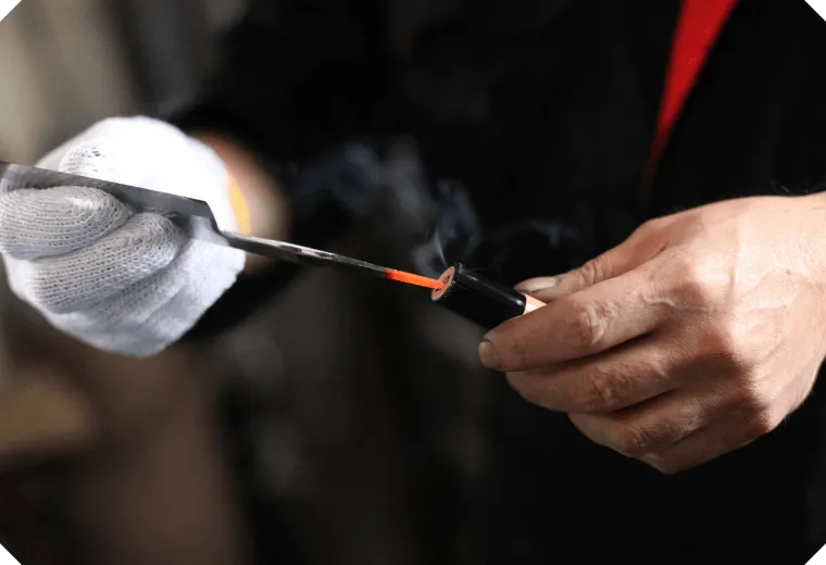包丁の柄入れ部分を熱して赤め、柄に差し込んでいきます。柄の底をハンマーで叩きながら、持ちやすく使いやすい角度に1丁1丁調整しながら柄を焼き込みます。